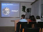 Dny astronomie 2007 na Hvězdárně Vsetín Ve dnech 2. 4. května se na vsetínské hvězdárně poprvé uskutečnila akce s názvem Dny Astronomie. Návštěvníci měli možnost vyslechnout celkem šest přednášek: 2. května Komety a jiné úkazy v roce 2007, přednášející Jiří Srba, Exoplanety, přednášející Emil Březina; 3. května Mlhoviny kolébky i hrobky hvězd, přednášející Pavel Svozil, Novinky ze sluneční soustavy, přednášející Jiří Srba; 4. května Vesmírné teleskopy, přednášející Michal Václavík, Komety posledních třiceti let, přednášející Martin Zapletal. V následující fotogalerii vám přinášíme několik snímků z těchto přednášek. Autory fotografií jsou Emil Březina a Jiří Srba. Zpět na výběr fotogalerie