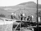 Základy původní budovy a kopule vsetínské hvězdárny ve fázi betonování. Pohled ze severní strany směrem na údolí Rokytenky a Žambošku. |