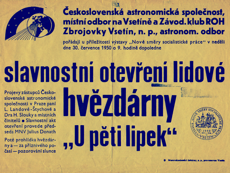 Tištěný plakát zve vsetínskou veřejnost na slavnostní otevření nové hvězdárny. |