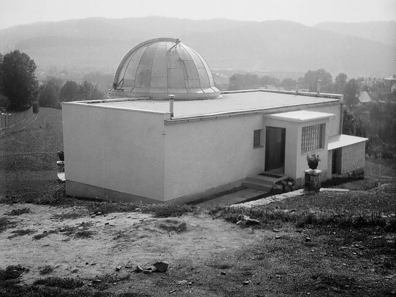 Pohled na hvězdárnu ze současného hřbitova. Povšimněte si odlesněného okolí, které je dnes zarostlé vysokými stromy. Vlevo od budovy stojí stará meteorologická stanice. |