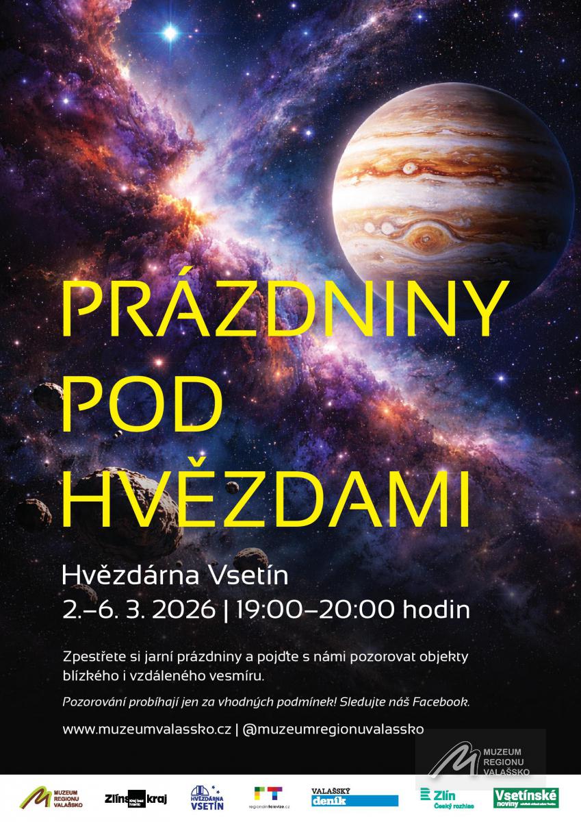 Mimořádná večerní pozorování proběhnou v době jarních prázdnin místních škol na Hvězdárně Vsetín. Akce bude zaměřena především na pozorování největší planety Sluneční soustavy Jupiteru, ale i vybraných jasnějších objektů ze vzdáleného vesmíru. Upozorňujeme, že pozorování daný den probíhá pouze za vhodných podmínek. O případném zrušení Vás budeme informovat nejpozději hodinu před plánovaným začátkem na Facebooku Muzeum regionu Valašsko (@muzeumregionuvalassko)